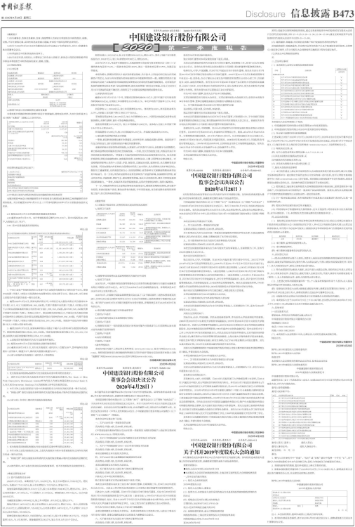 中国建设银行股份有限公司(以下简称“本行”)董事会会议(以下简称“本次会议”)于2020年4月28日在北京以现场会议方式召开。本行于2020年4月14日以书面形式发出本次会议通知。本次会议由田国立董事长主持,应出席董事14名,实际亲自出席董事14名。本次会议的召开符合《中华人民共和国公司法》、《中国建设银行股份有限公司章程》(以下简称“《公司章程》”)等规定。