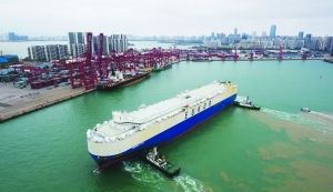 ▲ 滚装货船“劳拉”轮驶入海口秀英港