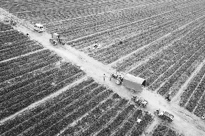 盛夏渐近,位于甘肃省金昌市金川区的粤港澳大湾区“菜篮子”(金昌)生产基地的多种蔬菜陆续丰收。该基地种植面积达1.3万多亩,采用高效喷灌、精量播种等技术,以及“企业+合作社+基地+农户”的模式,通过轮作倒茬、循环供应的方式,每年可种植蔬菜3至4茬,亩均产量2000公斤左右,总产值达1.5亿元。图为生产基地工作人员在采摘蔬菜(无人机照片)。 新华社图文