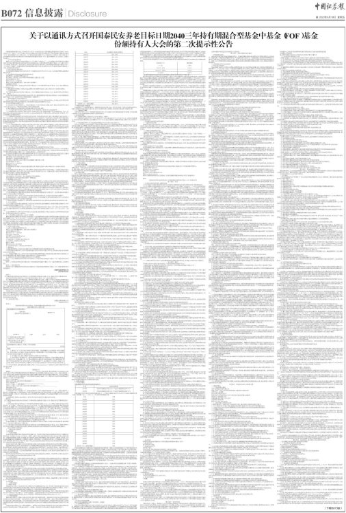 根据《中华人民共和国证券投资基金法》(以下简称“《基金法》”)、《公开募集证券投资基金运作管理办法》等法律法规的规定和《国泰民安养老目标日期2040三年持有期混合型基金中基金(FOF)基金合同》(以下简称“基金合同”)的有关约定,国泰民安养老目标日期2040三年持有期混合型基金中基金(FOF)(以下简称“本基金”)的基金管理人国泰基金管理有限公司决定以通讯方式召开本基金的基金份额持有人大会,会议的具体安排如下: