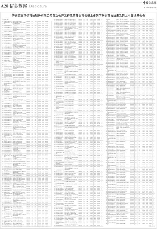 济南恒誉环保科技股份有限公司首次公开发行股票并在科创板上市网下初步配售结果及网上中签结果公告