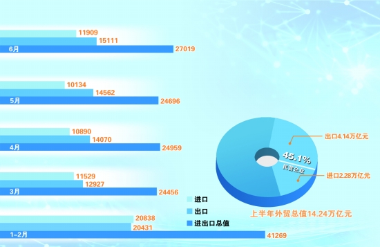 6月份,我国出口、进口首次迎来年内双双同比正增长,回升态势好于预期。出口自4月份起连续3个月实现正增长。上半年进出口总值同比下降3.2%,降幅较前5个月收窄1.7个百分点。民营企业进出口呈现逆势增长态势。