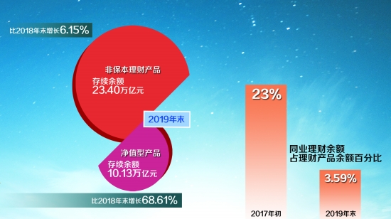 2019年末,非保本理财产品4.73万只,存续余额23.40万亿元,同比增长6.15%。净值型理财产品发行力度不断加大。