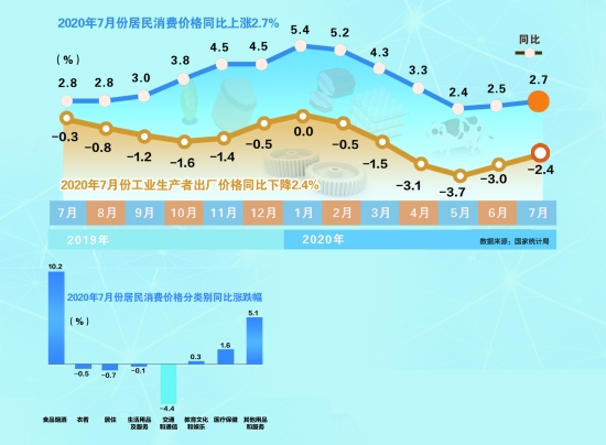 国家统计局8月10日发布数据显示,7月,全国居民消费价格指数(CPI)同比上涨2.7%,涨幅比上月扩大0.2个百分点。国家统计局城市司高级统计师董莉娟表示,从同比看,7月工业生产者出厂价格指数(PPI)下降2.4%,降幅比上月收窄0.6个百分点。(本报记者 倪铭娅)