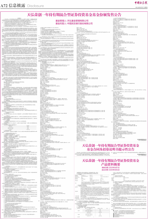 1、天弘荣创一年持有期混合型证券投资基金(以下简称“本基金”)的募集已获中国证监会2020年8月6日证监许可【2020】1683号文注册募集。中国证监会对本基金的注册并不代表中国证监会对本基金的风险和收益作出实质性判断、推荐或者保证。