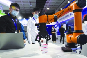 下图:9月17日,两名参观者在参观一款抓取机器人。