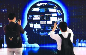 上图:9月17日,两名参观者在观看城市大脑展示。