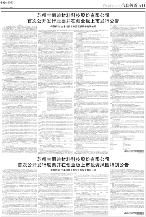3. 发行人与保荐机构(主承销商)郑重提示广大投资者注意投资风险,理性投资,认真阅读本公告及2020年10月22日(T-1日)刊登在《中国证券报》、《上海证券报》、《证券时报》和《证券日报》上的《苏州宝丽迪材料科技股份有限公司首次公开发行股票并在创业板上市投资风险特别公告》。