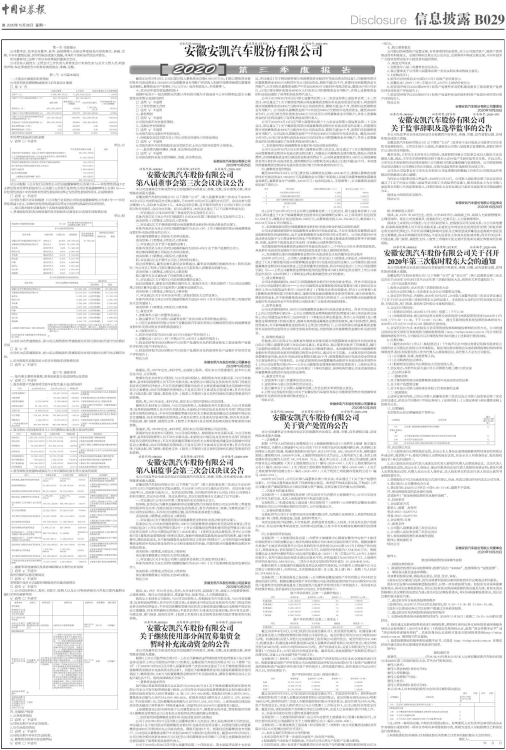 安徽安凯汽车股份有限公司(以下简称“公司”)第八届董事会第三次会议于2020年10月12日以书面和电话方式发出通知,于2020年10月23日以通讯方式召开。会议应参与表决董事11人,实际参与表决11人。本次会议的召集、召开程序均符合《公司法》和《公司章程》的有关规定,会议合法有效。经过认真审议,本次会议通过了以下议案并形成决议: