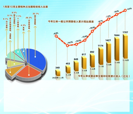 中国证券报记者18日从财政部获悉,10月,全国一般公共预算收入17531亿元,同比增长3%;扣除去年同期特定国有金融机构和央企上缴利润等抬高基数因素后增长9%左右,实际增幅比上月继续提高,反映经济运行持续稳步恢复。年内主要经济指标仍将延续恢复性增长态势,财政收入累计增速降幅会逐步收窄。 10月,全国税收收入增长11.2%。分税种看,规模性助企纾困政策加快落实,企业生产经营加快恢复,工业增加值、服务业生产指数、企业利润等主要经济指标持续改善,主体税种增幅回升。其中,国内增值税增长9.1%,企业所得税增长15.7%,个人所得税增长23.7%,进口货物增值税消费税增长6.3%。同时,房地产市场回暖,带动契税、土地增值税分别增长38.5%、15.3%。 此外,经国务院批准,近期已下达用于支持化解地方中小银行风险的新增专项债券额度2000亿元,目前分地区额度已全部下达。(赵白执南)