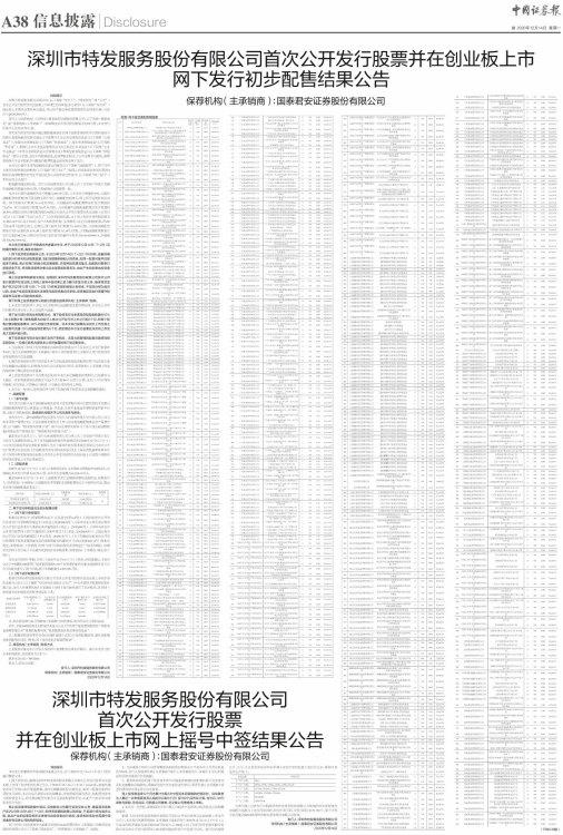 根据《深圳市特发服务股份有限公司首次公开发行股票并在创业板上市发行公告》,本次发行的保荐机构(主承销商)国泰君安于2020年12月11日(T+1日)上午在深圳市罗湖区深南东路5045号深业中心308室主持了深圳市特发服务股份有限公司首次公开发行股票网上按市值申购定价发行中签摇号仪式。摇号仪式按照公开、公平、公正的原则在深圳市罗湖公证处代表的监督下进行并公证。现将中签结果公告如下: