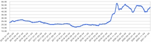 2016年以来农业农村部发布的全国农产品批发市场猪肉均价(单位:元/公斤)