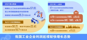 国家统计局最新数据显示,4月,规模以上工业企业利润同比增长57.0%,两年平均增长22.6%,比3月加快10.7个百分点。