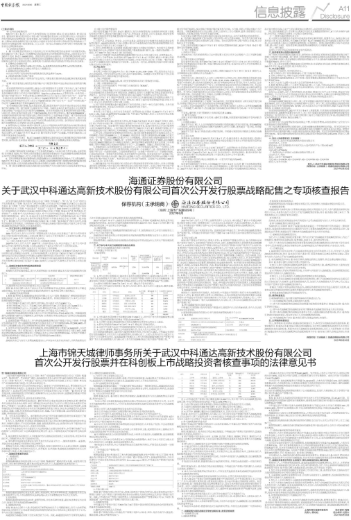 上海市锦天城律师事务所(以下简称“本所”)受海通证券股份有限公司(以下简称“海通证券”、“保荐机构”、“主承销商”)委托,就战略投资者参与武汉中科通达高新技术股份有限公司(以下简称“发行人”、“中科通达”)首次公开发行股票并在科创板上市(以下简称“本次发行”)的战略配售进行核查,并出具本法律意见书。