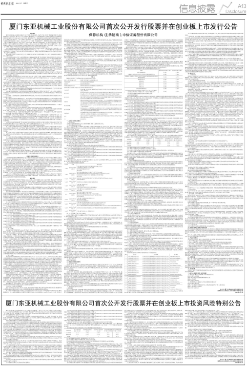 厦门东亚机械工业股份有限公司首次公开发行股票并在创业板上市发行公告