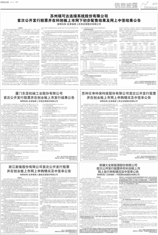 根据《发行公告》,发行人和保荐机构(主承销商)于2021年7月13日(T+1日)上午在上海市浦东新区东方路778号紫金山大酒店四楼会议室海棠厅主持了苏州瑞可达连接系统股份有限公司首次公开发行股票网上发行摇号抽签仪式。摇号仪式在公开、公平、公正的原则下进行,摇号过程及结果已经上海市东方公证处公证。中签结果如下:
