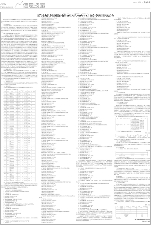 ●委托理财产品名称:兴业银行企业金融人民币结构性存款产品、中国光大银行对公结构性存款产品、兴业银行企业金融人民币结构性存款产品、光大银行结构性存款、交通银行蕴通财富定期型结构性存款、农商银行结构性存款、厦门银行结构性存款、中国银行结构性存款、农业银行汇利丰2021年第4608期结构性存款、农业银行汇利丰2021年第4918期结构性存款、农业银行汇利丰2021年第5233期结构性存款、农业银行汇利丰2021年第5316期结构性存款、2021年挂钩汇率对公结构性存款定制第四期产品43、蕴通财富定期型结构性存款71天(挂钩汇率看跌)、2021年挂钩汇率对公结构性存款定制第五期产品58、挂钩汇率区间累计型法人结构性存款-专户型2021年第132期Q款、蕴通财富定期型结构性存款38天(挂钩汇率看涨)、2021年挂钩汇率对公结构性存款定制第五期产品222、2021年挂钩汇率对公结构性存款定制第五期产品474、2021年挂钩汇率对公结构性存款定制第六期产品25、2021年挂钩汇率对公结构性存款定制第六期产品97、挂钩汇率区间累计型法人结构性存款-专户型2021年第176期Z款、农商银行结构性存款产品(挂钩黄金)2021-148期、兴业银行30天封闭式结构性存款、农商银行结构性理财产品、工商银行结构性存款理财产品、中国工商银行挂钩汇率区间累计型法人人民币结构性存款产品-专户型2021年第083期D款、中国建设银行单位结构性存款2021年第121期、2021年挂钩汇率对公结构性存款定制第四期产品250、金龙联合汽车工业(苏州)有限公司30天封闭式产品、利多多公司稳利21JG6074期(1个月看涨网点专属)人民币对公结构性存款、中国工商银行挂钩汇率区间累计型法人人民币结构性存款产品-专户型2021年第129期C款、2021年挂钩汇率对公结构性存款定制第五期产品218、中国建设银行单位结构性存款2021年第172期。