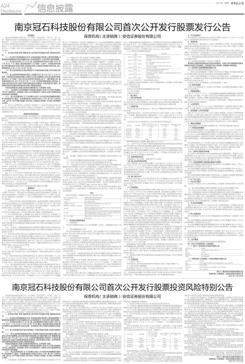 2、 发行人与保荐机构(主承销商)郑重提示广大投资者注意投资风险,理性投资,认真阅读本公告以及同日刊登在《中国证券报》、《上海证券报》、《证券时报》和《证券日报》上的《南京冠石科技股份有限公司首次公开发行股票投资风险特别公告》。