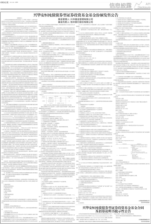 12、本公告仅对本基金发售的有关事项和规定予以说明,投资人欲了解本基金的详细情况,请阅读刊登在中国证监会基金电子信息披露网站(http://eid.csrc.gov.cn/fund)和发布在基金管理人互联网网站(www.xinghuafund.com.cn)的《兴华安恒纯债债券型证券投资基金基金合同》和《兴华安恒纯债债券型证券投资基金招募说明书》。本基金的基金合同、招募说明书、产品资料概要及本公告将同时发布在基金管理人的互联网网站。