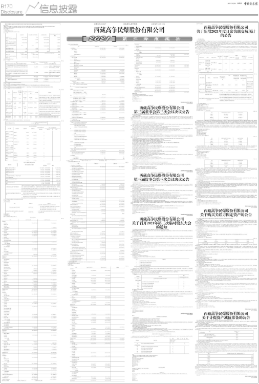 西藏高争民爆股份有限公司(以下简称“公司”)第三届董事会第三次会议于2021年10月17日以电话、邮件、书面送达等方式发出通知,2021年10月27日上午9:30在公司三楼会议室以现场结合通讯方式召开。本次会议应到董事9人,实到董事9人,其中,多吉罗布、白永生、潘磊以通讯方式与会,列席监事:巴桑顿珠、汪玉君、王川、旺堆、尹晓瑜,列席高级管理人员万红路、刘长江、石科红、王乐。会议由公司董事长乐勇建先生召集并主持。本次会议的召集、召开和表决程序符合《中华人民共和国公司法》等法律、法规及《公司章程》的有关规定,合法有效。