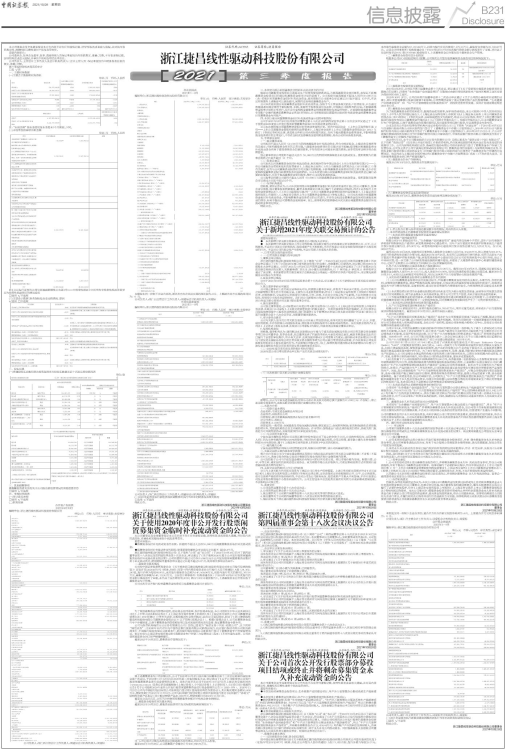 浙江捷昌线性驱动科技股份有限公司(以下简称“公司”)第四届董事会第十八次会议于2021年10月26日在公司会议室以现场结合通讯表决的方式召开。本次董事会应出席董事9人,实到董事或其代表9名。公司监事、高级管理人员列席了会议。本次会议的召集、召开符合《中华人民共和国公司法》(以下简称“《公司法》”)和《浙江捷昌线性驱动科技股份有限公司章程》(以下简称“《公司章程》”)及其他有关法律法规的规定,会议合法有效。