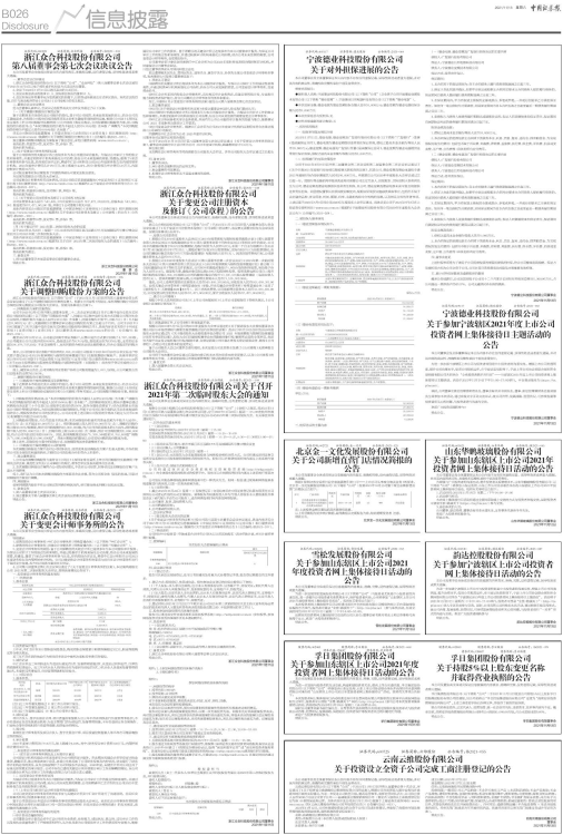 为进一步加强宁波辖区上市公司与投资者特别是中小投资者的沟通交流,增强上市公司的透明度,提升治理水平,促进公司规范运作,在宁波证监局指导下,宁波上市公司协会联合深圳市全景网络有限公司举办“宁波辖区2021年度上市公司投资者网上集体接待日主题活动”。活动将于2021年11月18日(星期四)下午15:00-17:00举行,投资者可登录“全景·路演天下”(http://rs.p5w.net)进入专区页面参与交流。届时,公司高管人员将参加本次活动,通过网络在线交流形式,就公司治理、发展战略、经营状况、可持续发展等投资者所关心的问题,与投资者进行“一对多”形式的沟通与交流。欢迎广大投资者踊跃参与!