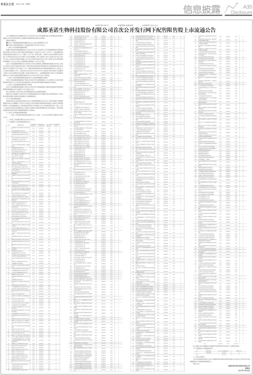 成都圣诺生物科技股份有限公司首次公开发行网下配售限售股上市流通公告