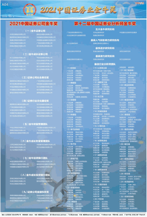 (1)宏观组 广发证券 郭磊团队 兴业证券 王涵团队 天风证券 宋雪涛团队 华创证券 张瑜团队 浙商证券 李超团队 (2)策略组 广发证券 戴康团队 兴业证券 张忆东、张启尧团队 海通证券 荀玉根团队 申万宏源证券 王胜、傅静涛、林丽梅、金倩婧团队 天风证券 刘晨明、徐彪团队 (3)采掘组 广发证券 安鹏团队 信达证券 左前明团队 天风证券 张樨樨团队 安信证券 周泰团队 海通证券 李淼团队 (4)传媒组 广发证券 旷实团队 兴业证券 李阳团队 招商证券 顾佳团队 安信证券 焦娟团队 海通证券 毛云聪团队 (5)电气设备组 东吴证券 曾朵红团队 长江证券 邬博华团队 海通证券 张一弛团队 广发证券 陈子坤团队 兴业证券 朱玥团队 (6)电子组 广发证券 许兴军团队 天风证券 潘暕团队 兴业证券 谢恒团队 招商证券 鄢凡团队 申万宏源证券 骆思远团队 (7)房地产组 广发证券 郭镇、乐加栋团队 海通证券 涂力磊团队 兴业证券 阎常铭团队 天风证券 陈天诚团队 招商证券 赵可团队 (8)纺织服装组 浙商证券 马莉、林骥川团队 长江证券 于旭辉团队 兴业证券 赵树理团队 广发证券 糜韩杰团队 申万宏源证券 王立平团队 (9)非银金融组 广发证券 陈福团队 海通证券 孙婷团队 招商证券 郑积沙团队 天风证券 夏昌盛团队 华创证券 徐康团队 (10)钢铁组 广发证券 李莎团队 海通证券 刘彦奇团队 中泰证券 郭皓团队 (11)公用事业组 申万宏源证券 刘晓宁团队 长江证券 张韦华、徐科团队 广发证券 郭鹏团队 海通证券 吴杰团队 安信证券 邵琳琳团队 (12)国防军工组 兴业证券 石康团队 长江证券 王贺嘉团队 申万宏源证券 韩强团队 东方证券 王天一团队 海通证券 张恒晅团队 (13)化工组 海通证券 邓勇团队 长江证券 马太团队 申万宏源证券 宋涛、谢建斌团队 天风证券 李辉团队 安信证券 张汪强团队 (14)机械设备组 中信建投证券 吕娟团队 浙商证券 邱世梁、王华君团队 长江证券 赵智勇团队 广发证券 代川团队 海通证券 佘炜超团队 (15)计算机组 申万宏源证券 周海晨团队 广发证券 刘雪峰团队 海通证券 郑宏达团队 长江证券 凌润东团队 兴业证券 蒋佳霖团队 (16)家用电器组 长江证券 管泉森团队 广发证券 曾婵团队 海通证券 陈子仪团队 安信证券 张立聪团队 开源证券 吕明团队 (17)建筑材料组 长江证券 范超团队 广发证券 邹戈团队 国泰君安证券 鲍雁辛团队 海通证券 冯晨阳团队 长城证券 濮阳团队 (18)建筑装饰组 长江证券 毕春晖团队 兴业证券 孟杰团队 海通证券 张欣劼团队 华创证券 王彬鹏团队 天风证券 鲍荣富团队 (19)交通运输组 长江证券 韩轶超团队 华创证券 吴一凡团队 兴业证券 张晓云团队 海通证券 虞楠团队 招商证券 苏宝亮团队 (20)汽车组 广发证券 张乐团队 长江证券 高登团队 兴业证券 戴畅团队 招商证券 汪刘胜团队 华西证券 崔琰团队 (21)轻工制造组 申万宏源证券 屠亦婷团队 天风证券 范张翔团队 西南证券 蔡欣团队 浙商证券 史凡可团队 长江证券 蔡方羿团队 (22)商业贸易组 天风证券 刘章明团队 广发证券 洪涛团队 长江证券 李锦团队 海通证券 汪立亭团队 华创证券 王薇娜团队 (23)食品饮料组 长江证券 董思远团队 安信证券 苏铖团队 广发证券 王永锋团队 中信建投证券 安雅泽团队 招商证券 于佳琦团队 (24)通信组 海通证券 朱劲松团队 天风证券 唐海清、王奕红团队 长江证券 于海宁团队 招商证券 余俊团队 华西证券 宋辉团队 (25)医药生物组 兴业证券 医药生物团队 东吴证券 朱国广团队 海通证券 余文心团队 广发证券 罗佳荣团队 中信建投证券 贺菊颖团队 (26)银行组 广发证券 倪军团队 浙商证券 邱冠华团队 中泰证券 戴志锋团队 兴业证券 陈绍兴团队 海通证券 解巍巍团队 (27)有色金属组 长江证券 王鹤涛团队 广发证券 巨国贤团队 兴业证券 邱祖学团队 海通证券 施毅团队 招商证券 刘文平团队 (28)综合组 天风证券 孙彬彬、吴先兴团队 开源证券 孙金钜、任浪团队 (29)休闲服务组 兴业证券 刘嘉仁团队 广发证券 沈涛团队 长江证券 赵刚团队 申万宏源证券 王立平团队 天风证券 孙海洋团队 (30)农林牧渔组 长江证券 陈佳团队 广发证券 王乾团队 天风证券 吴立团队 海通证券 丁频团队 申万宏源证券 赵金厚团队