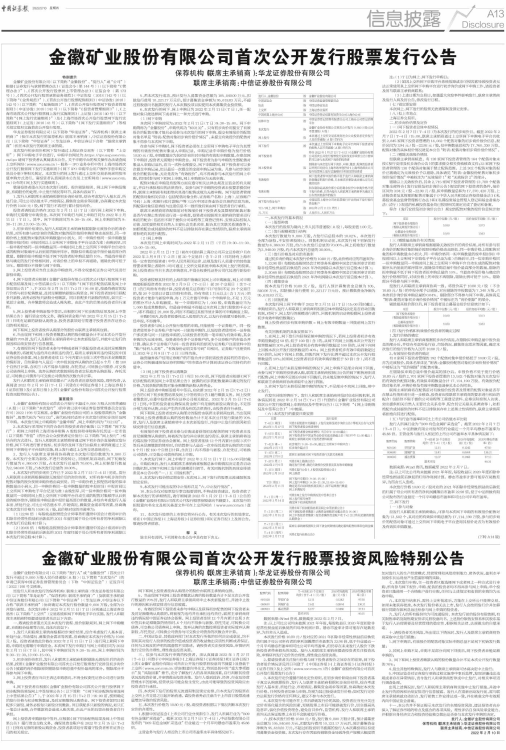 10、本公告仅对股票发行事宜扼要说明,不构成投资建议。投资者欲了解本次发行的详细情况,请仔细阅读2022年1月27日(T-6日)公告的《金徽矿业股份有限公司首次公开发行股票招股意向书摘要》。本次发行的招股意向书全文及相关备查文件可在上交所网站(www.sse.com.cn)查询。