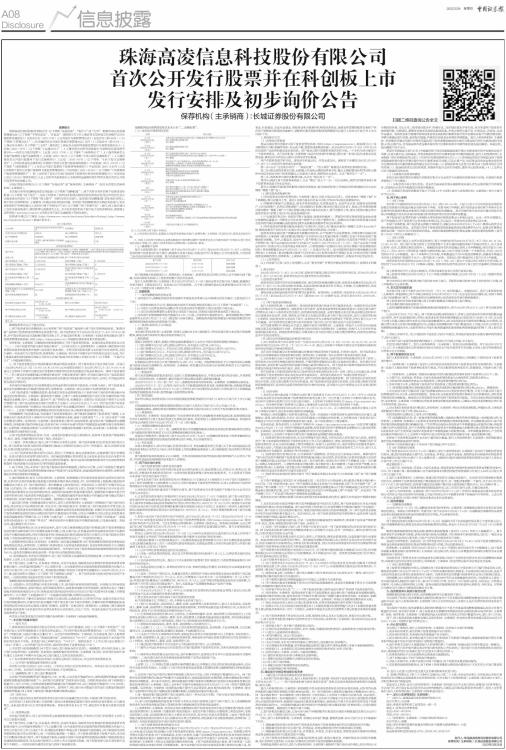 8、投资风险特别公告:初步询价结束后,发行人和主承销商确定的发行价格超过网下投资者剔除最高报价部分后剩余报价的中位数和加权平均数,以及公募产品、社保基金和养老金剩余报价的中位数和加权平均数的孰低值的,将在申购前发布的《珠海高凌信息科技股份有限公司首次公开发行股票并在科创板上市投资风险特别公告》(以下简称“《投资风险特别公告》”)中说明相关情况。