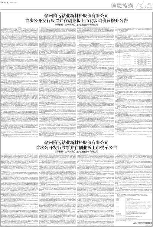 敬请投资者重点关注本次发行流程、网上网下申购及缴款、弃购股份处理等方面,并认真阅读今日刊登的《赣州腾远钴业新材料股份有限公司首次公开发行股票并在创业板上市初步询价及推介公告》(以下简称“《初步询价及推介公告》”)。具体内容如下: