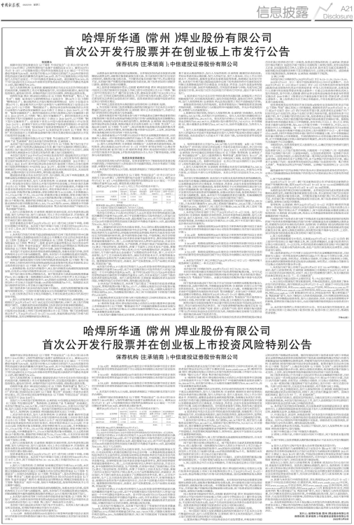 10、发行人和保荐机构(主承销商)郑重提示广大投资者注意投资风险,理性投资,请认真阅读2022年3月9日(T-1日)刊登在《中国证券报》《上海证券报》《证券时报》和《证券日报》上的《哈焊所华通(常州)焊业股份有限公司首次公开发行股票并在创业板上市投资风险特别公告》,充分了解市场风险,审慎参与本次新股发行。