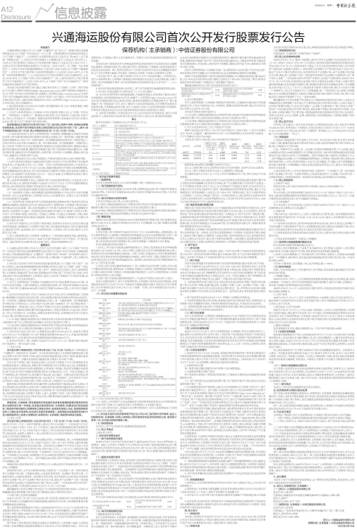 1、兴通海运股份有限公司首次公开发行人民币普通股(A股)(以下简称“本次发行”)的申请已获中国证券监督管理委员会证监许可〔2022〕303号文核准。兴通海运股份有限公司的A股股票简称为“兴通股份”,股票代码为“603209”,该代码同时适用于本次发行的初步询价及网下申购。本次发行网上申购简称“兴通申购”,网上申购代码为“732209”。