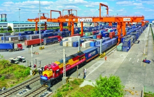 图为从成都国际铁路港发出的开往英国费利克斯托的中欧班列(无人机照片)。新华社图片