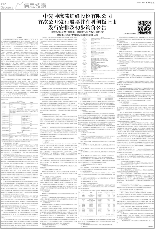 1、中复神鹰首次公开发行人民币普通股(A股)(以下简称“本次发行”)的申请已经上交所科创板股票上市委员会审议通过,并已经中国证券监督管理委员会(以下简称“证监会”)同意注册(证监许可〔2022〕337号)。本次发行的联席主承销商为国泰君安和中金公司。发行人股票简称为“中复神鹰”,扩位简称为“中复神鹰碳纤维”,股票代码为“688295”,该代码同时适用于本次发行的初步询价及网下申购。本次发行网上申购代码为“787295”。按照证监会《上市公司行业分类指引》(2012年修订),公司所处行业为化学纤维制造业(C28)。