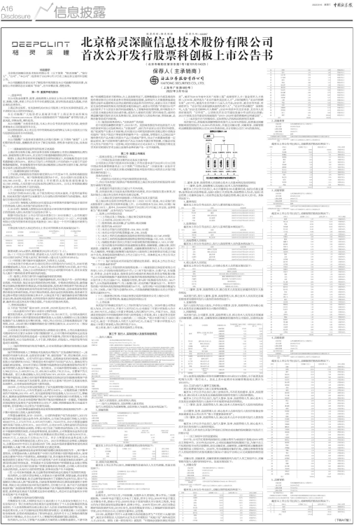 北京格灵深瞳信息技术股份有限公司(以下简称“格灵深瞳”、“发行人”、“公司”、“本公司”)股票将于2022年3月17日在上海证券交易所科创板上市。