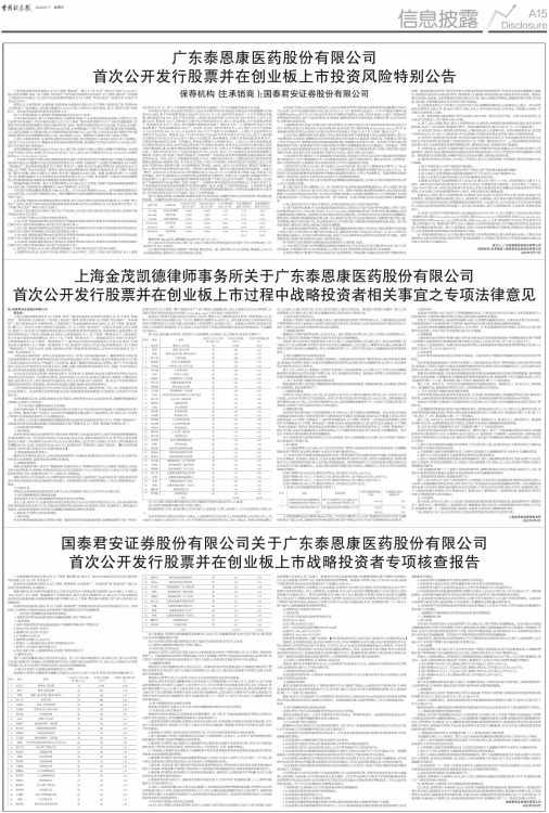 (3)提请投资者关注发行价格与网下投资者报价之间存在的差异,网下投资者报价情况详见同日刊登于《中国证券报》《上海证券报》《证券时报》和《证券日报》及巨潮资讯网(www.cninfo.com.cn)的《广东泰恩康医药股份有限公司首次公开发行股票并在创业板上市发行公告》(以下简称“《发行公告》”)。