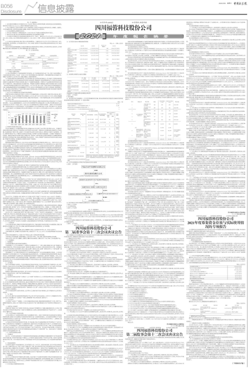 根据中国证券监督管理委员会(以下简称“中国证监会”)《上市公司监管指引第2号--上市公司募集资金管理和使用的监管要求》、《上海证券交易所上市公司自律监管指引第1号--规范运作》等法律、法规、规范性文件的规定,四川福蓉科技股份公司(以下简称“公司”)将2021年度募集资金存放与实际使用情况专项说明如下: