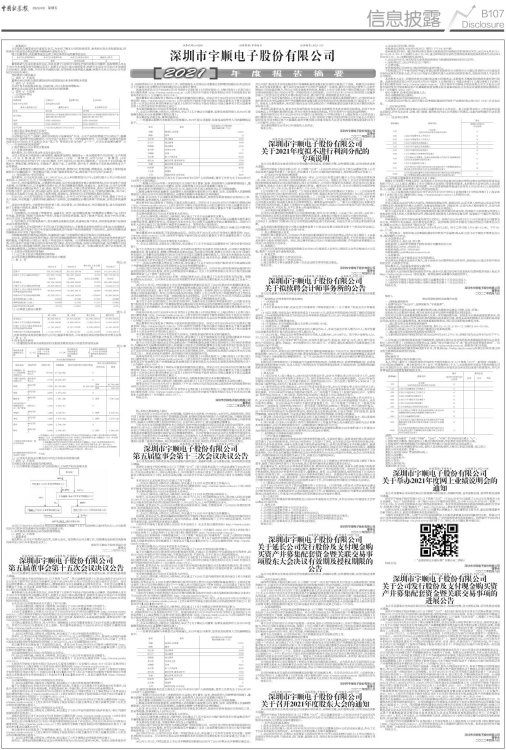 《深圳市宇顺电子股份有限公司2021年年度报告摘要》(公告编号:2022-013)详见《证券时报》《中国证券报》《上海证券报》《证券日报》和巨潮资讯网(http://www.cninfo.com.cn)。