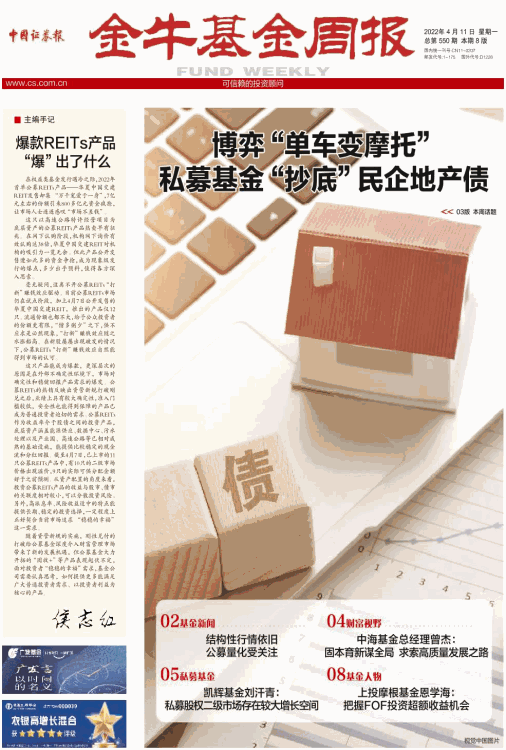 视觉中国图片03版 本周话题05私募基金凯辉基金刘汗青: 私募股权二级市场存在较大增长空间上投摩根基金恩学海: 把握FOF投资超额收益机会08基金人物04财富视野中海基金总经理曾杰: 固本育新谋全局 求索高质量发展之路02基金新闻结构性行情依旧 公募量化受关注博弈“单车变摩托” 私募基金“抄底”民企地产债