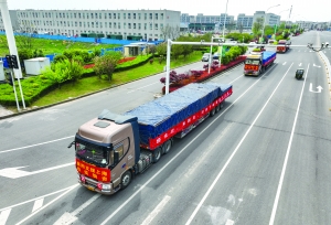 4月9日,装有蔬菜的车队从襄阳出发前往上海(无人机照片)。