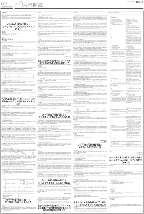 根据《上市公司监管指引第2号——上市公司募集资金管理和使用的监管要求(2022年修订)》和《上海证券交易所上市公司自律监管指引第1号——规范运作(2022年)》有关规定,金宇生物技术股份有限公司(以下简称“公司”、“本公司”)将2021年度募集资金存放与使用情况说明如下: