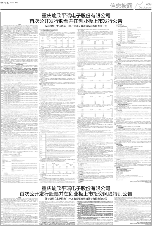7、发行人和保荐机构(主承销商)郑重提示广大投资者注意投资风险,理性投资,认真阅读本公告及同日刊登于《中国证券报》、《上海证券报》、《证券时报》、《证券日报》上的《重庆瑜欣平瑞电子股份有限公司首次公开发行股票并在创业板上市投资风险特别公告》(以下简称“《投资风险特别公告》”),充分了解市场风险,审慎参与本次新股发行。