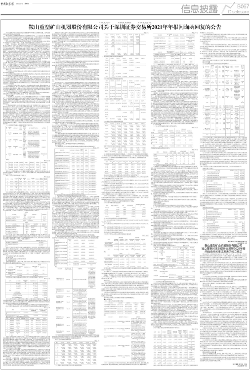 鞍山重型矿山机器股份有限公司(以下简称“公司”或“上市公司”)于近日收到深圳证券交易所公司部下发的《关于对鞍山重型矿山机器股份有限公司2021年年报的问询函》(公司部年报问询函[2022]第79号)(以下简称“问询函”)。作为公司独立董事,基于独立判断立场,根据问询函的要求,我们就问询函相关事项进行了核查,发表核查意见如下: