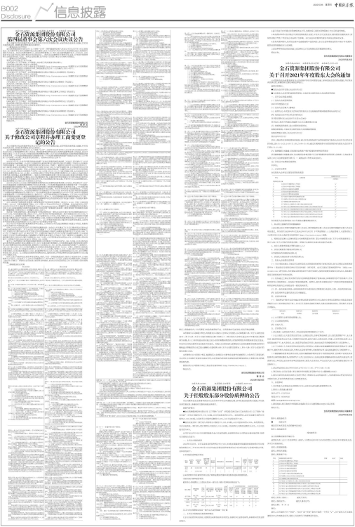 具体内容详见同日公司在上海证券交易所网站(http://www.sse.com.cn)披露的《金石资源集团股份有限公司关于修改公司章程并办理工商变更登记的公告》(公告编号:2022-031)。