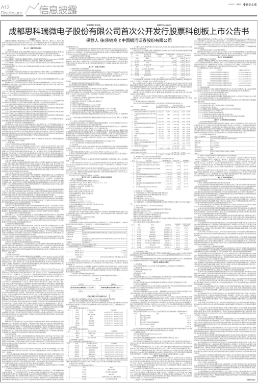 成都思科瑞微电子股份有限公司(以下简称“思科瑞”、“本公司”、“发行人”、“公司”)股票将于2022年7月8日在上海证券交易所上市。本公司提醒投资者应充分了解股票市场风险及本公司披露的风险因素,在新股上市初期切忌盲目跟风“炒新”,应当审慎决策、理性投资。