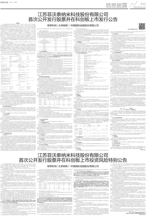 发行人和保荐机构(主承销商)郑重提示广大投资者注意投资风险,理性投资,认真阅读本公告及在2022年7月21日(T-1日)刊登在《中国证券报》、《上海证券报》、《证券时报》和《证券日报》上的《江苏菲沃泰纳米科技股份有限公司首次公开发行股票并在科创板上市投资风险特别公告》(以下简称“《投资风险特别公告》”)。