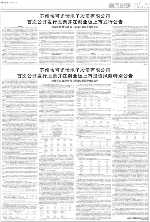 7、发行人和保荐机构(主承销商)郑重提示广大投资者注意投资风险,理性投资,请认真阅读2022年7月25日(T-1日)刊登在《中国证券报》《上海证券报》《证券时报》和《证券日报》上的《苏州快可光伏电子股份有限公司首次公开发行股票并在创业板上市投资风险特别公告》,充分了解市场风险,审慎参与本次新股发行。