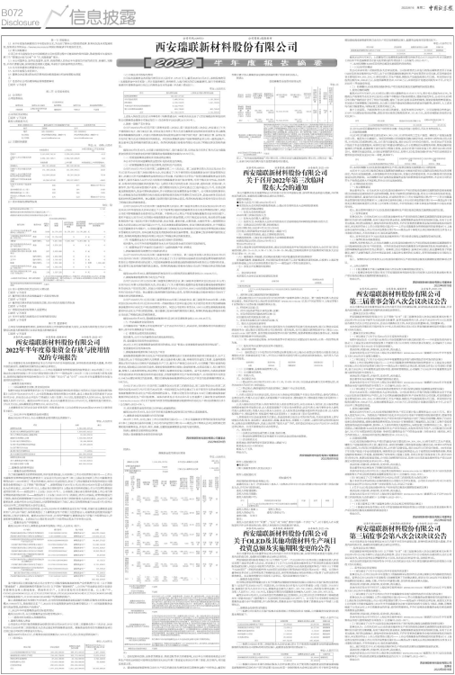根据《上市公司监管指引第2号——上市公司募集资金管理和使用的监管要求(2022年修订)》《上海证券交易所科创板上市公司自律监管指引第1号——规范运作(2022年)》及《公司章程》的有关规定,现将西安瑞联新材料股份有限公司(以下简称“本公司”或“公司”)2022年半年度募集资金存放与使用情况说明如下: