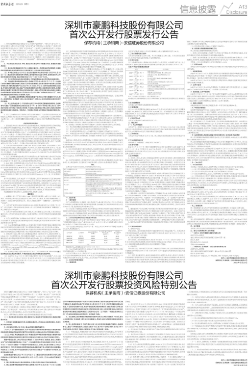 3、 发行人与保荐机构(主承销商)安信证券郑重提示广大投资者注意投资风险,理性投资,认真阅读本公告以及同日刊登在《中国证券报》、《上海证券报》、《证券时报》和《证券日报》上的《深圳市豪鹏科技股份有限公司首次公开发行股票投资风险特别公告》。